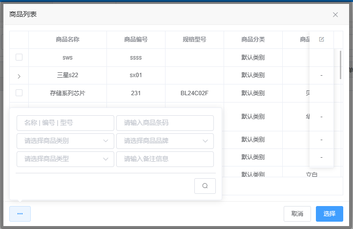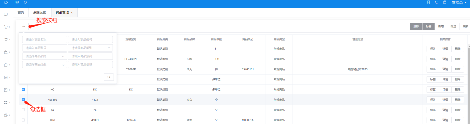 打开商品管理功能,则为商品列表,展示了目前添加在系统的所有商品,以及各商品的属性,左上角为多维度搜索,可以根据需求搜索获取对应商 品,列表第一列为多选框,勾选后,右上角会出现“删除”和“打印”标签两个按钮,同为批量删除、批量打印, 右上角还有 “新增”按钮,为增加商品信息功能,“批量”按钮,为批量导出和批量导入,“刷新”按钮则为刷新页面。导入时需先下载模板,然后根据模板提示填写商品信息。 列表最后一列 “相关操作” 中,“标签”为商品标签打印功能,标签显示有商品名称、商品编号、规格型号、辅助属性四项(也可自定义编辑,会在 "打印模板" 中讲到)。“详情” 则显示商品详细属性,可在详情 中修改商品属性信息,“删除” 为删除该商品,注意商品存在数据关联时不能进行删除。