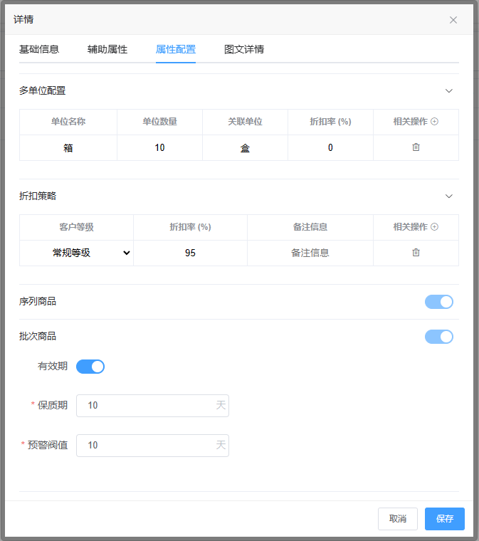 多单位配置,需要在商品基础信息中 单位字段选择“多单位”,这样在属性配置页才能看到多单位配置,然后在配置信息中 “单位名称” 为大单位量,“单位数量”为换算比例,“关联单位“ 为小单位量,例如图:单位名称(箱)里面有单位数量(10)的关联单位(盒),意思就是1箱有10盒。第一行的关联单位为最小单位,向下逐层递增大单位。