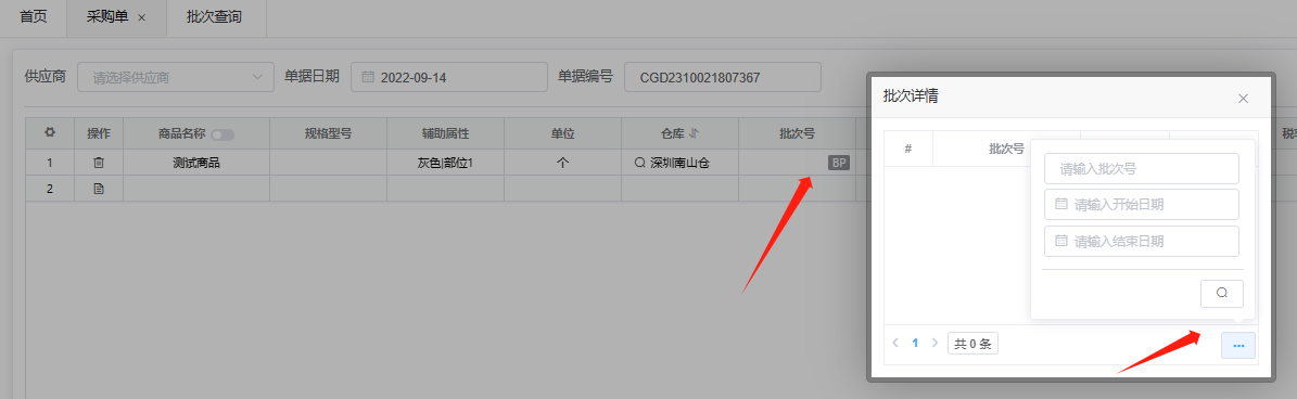 批次商品适用于带有批次号的商品使用,例如食品类存在批次保质期的商品,如果开启有效期,则需要填写保质期及预警阀值,未开启则无需填写,批次商品在单据中添加后,点击批次号后面的“BP”,“BP”中若无批次,则表示该商品还未添加批次号,手动输入批次号即可,有效期也开启的话,对应商品的生产日期也需要选择。