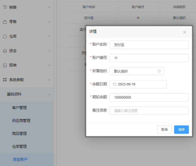 资金账户是ERP系统中财务模块的核心组成部分之一,用于记录和监控用户的资金收入和支出。在购/销单据、收/支款单中都需要选择资金账户,用于记录用户的收支情况, 系统可通过资金账户的记录和分析提供各种报表和图表,用于分析资金的收支来源,支出项目等关键指标,以便用户进行财务决策和管理。余额日期和期初余额是与账户余额相关的两个概念,余额日期为账户余额截止日期,期初余额是指在特定周期开始时,账户的初始余额,结合使用则为账户初建时账户余额情况,以便进行后续的账务处理和计算。