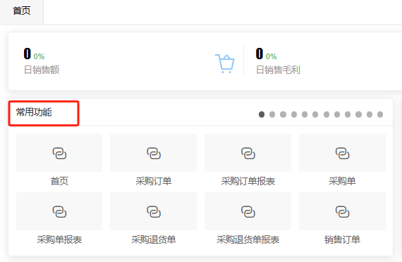 数据模块包括:每日系统部分数据统计、常用功能、汇总信息、数据概览、资产数据和资金数据,这些数据展示可以帮助您了解企业的运营情况和财务状况。注:常用功能可理解为快捷功能,每个用户可根据自己对某一功能的使用频率添加到常用功能中,添加操作在辅助资料中的常用功能内。