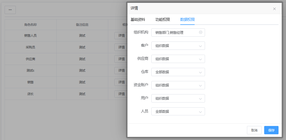 角色定义:在ERP系统中,角色通常根据用户的职责和工作职能进行定义。每个角色都包含一组相关的权限和功能,使用户能够执行其工作所需的操作。 功能权限配置:角色管理涉及到为每个角色分配适当的权限。这些权限可以基于用户需要的数据访问、功能操作以及系统配置等方面进行配置。例如,某个角色可能具有访问和编辑销售订单的权限,但没有修改系统设置的权限。 角色层级:在组织中,不同层级的用户可能需要不同的角色和权限。因此,角色管理需要考虑到用户的职位级别和组织层级,以确保角色的分配与用户的职责和权限相匹配,所以在设置 “数据权限” 时 需要注意该角色设定隶属于哪个组织部门,或者跨部门组织(多选)。 数据权限配置:数据内容包括:客户、供应商、仓库、资金账户、用户和人员,选择范围有:全部数据、组织数据、用户数据。全部数据顾名思义为系统全部数据都可查看获取,组织数据则为角色勾选设定的组织数据,用户数据为当前登录用户自己创建的数据。 角色维护:随着组织结构和业务需求的变化,角色管理需要进行维护和更新。这包括添加新角色、修改现有角色的权限、删除不再需要的角色等操作。