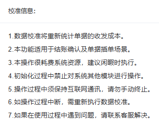 数据核准将重新统计单据的收发成本,本功能适用于结账确认及单据插单场景,本操作很耗费系统资源,建议闲暇时执行,初始化过程中禁止对系统其他模块进行操作,操作过程中须保持互联网通讯,请勿手动终止,如操作过程中断,需重新执行数据校准。