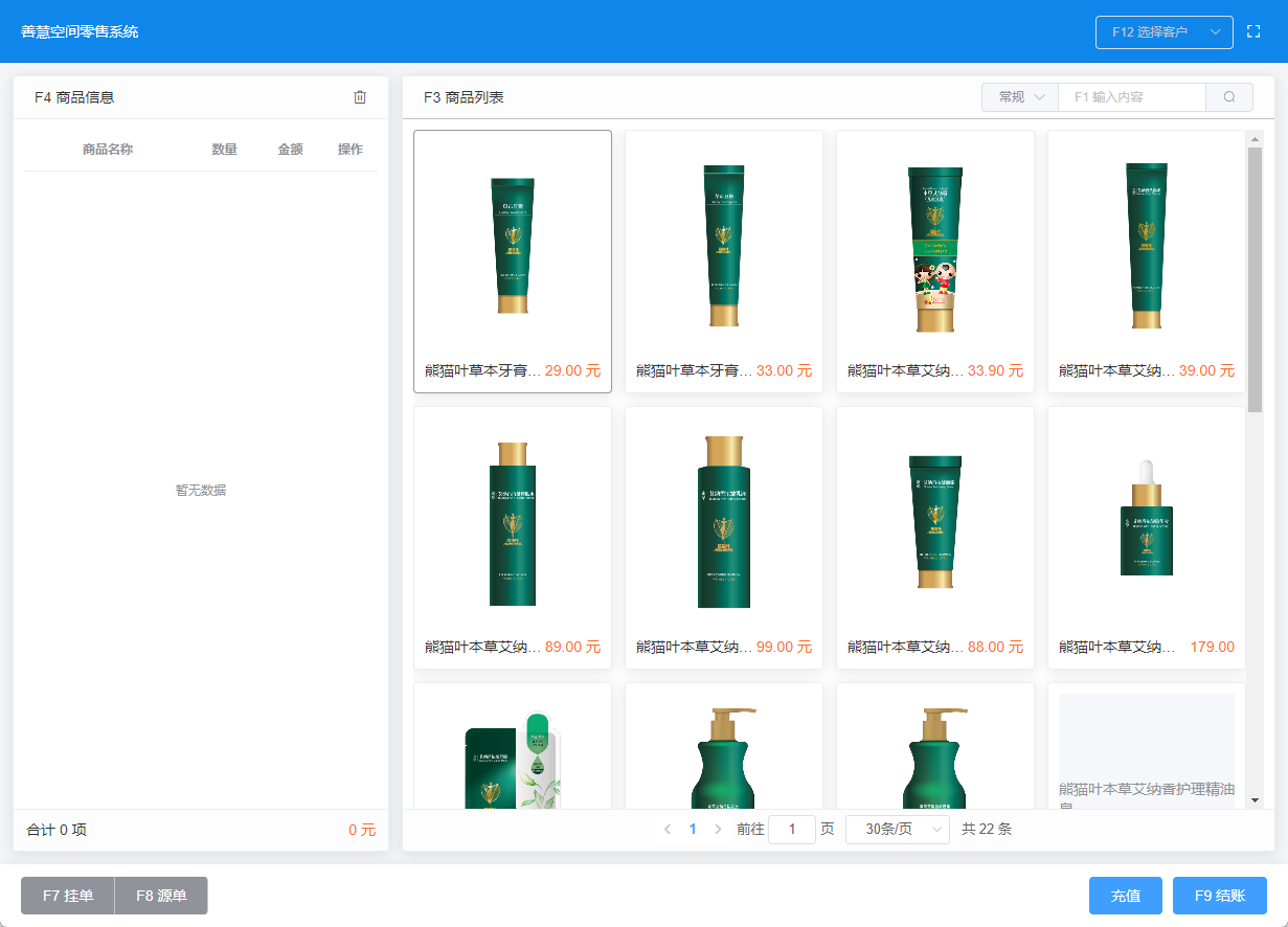 ESC按键可以关闭选择、搜索等界面,同时完成收银后也能关闭结账页面,开始新的收银结算; ENTER回车确认按键; F3选择商品时按回车键选择商品, F4商品清单中按回车打开商品详情选择填写仓库等信息, F5清空商品清单时按回车确定清空商品, F8源单中选择挂起的源单后按回车选择打开挂起的源单, F1——F12按键说明 F1 搜索商品; F2 切换搜索方法,常规手动输入搜索,扫码搜索; F3 切换选择商品,通过上下左右键选择商品,回车确定选择商品到左边清单; F4 切换到商品清单,回车打开商品详情选择填写商品信息; F5 清空重置商品清单; F7 挂单是将目前的商品清单暂时挂起,可在源单中查看挂起的清单; F8 源单是暂时存储挂起的清单,可以通过上下键切换源单,回车选择回复商品清单; F9 结账是结算目前商品清单的价格; ALT+1、2、3...选择结算类型,现金、支付宝、微信等添加的结算类型; F10 结算完成后按F10进行小票打印; F11 切换全屏显示; F12 选择客户,开启选择客户后可以通过F1输入内容进行搜索;