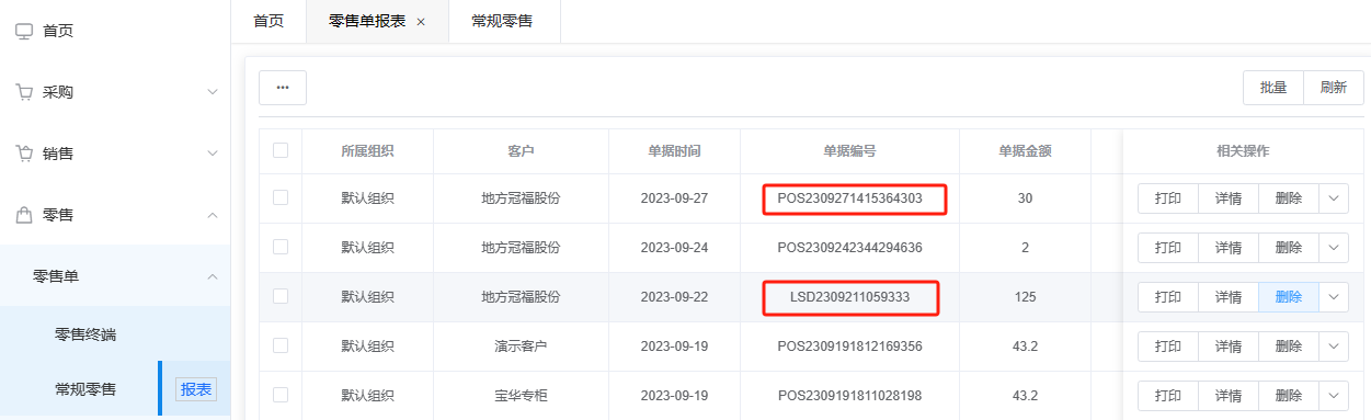 常规零售与零售终端新增的单据都可以在常规零售的报表中查看,如(图 6 - 2)零售终端单据编号是POS开头,常规零售单位LSD开头,是有区分的。