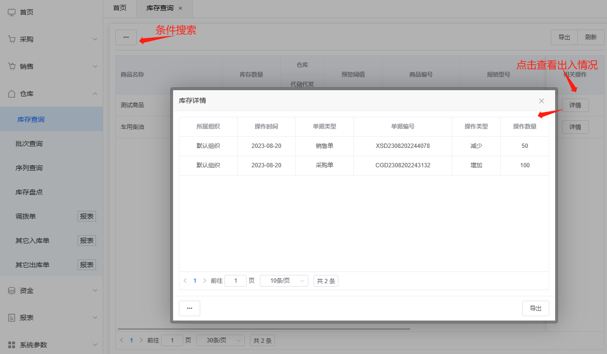 实际操作: 系统默认将遍历目前所有商品存储信息(常规库存),左上角搜索按钮中可以根据需求填写数据进行多维度的查询,搜索中可以选择常规库存、非零库存、预警库存三种状态,对商品进行筛选,表格第一列商品名称前有小三角标志,及表示该商品可展开查看(包含辅助属性商品),详情按钮可以查看该商品的详细进出库单据信息,导出功能为批量导出,根据分页数量为准,可根据导出需求数量切换页面条数。