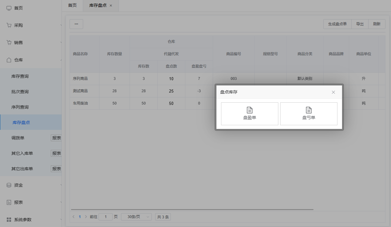 然后用户可点击右上角 "生成盘点单",选择盘盈单或者盘亏单。 选择单据类型后会自动将对应商品及盘点差值带入单据中,并且默认选择所盘点仓库,或者导出商品清单,根据清单内容盘点对应商品的实际库存。