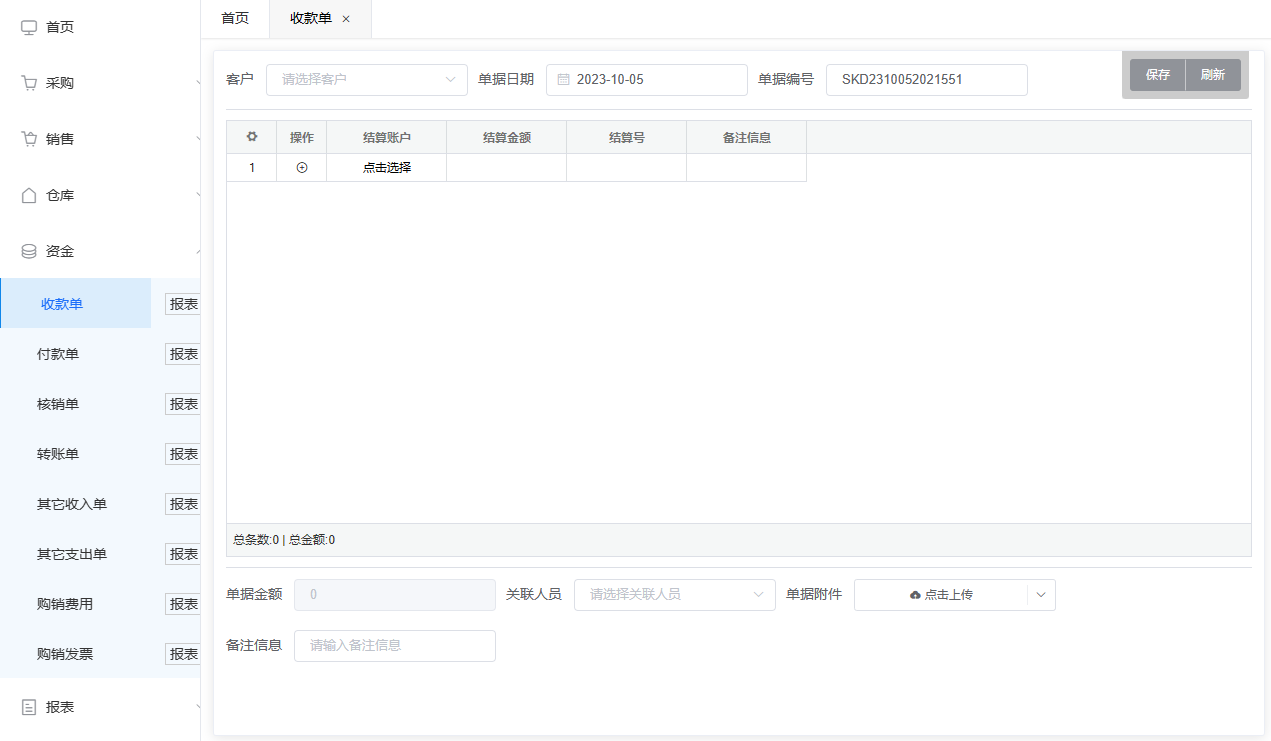 收款单是做客户预收款的单据,需选择结算客户,单据日期等,并添加结算记录,选择结算账户,填写结算金额,可以点击操作列内“加号”字符添加多条,保存审核单据后金额会存入对应的资金账户,并记录选择客户间的往来记录,并且可在报表中查看所有增加的付款单数据以及单据状态等。