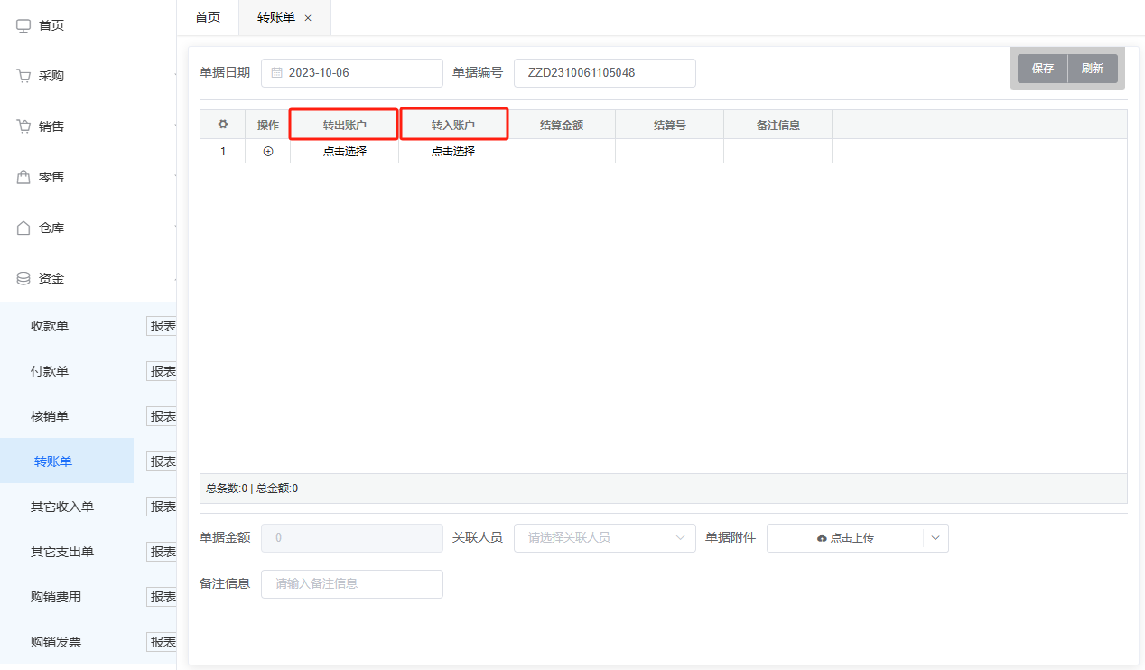 转账单是资金在不同账户之间转移的财务单据,可以从资金账户A中转账到资金账户B中的操作,选择转出、转入账户、填写结算金额、结算号等数据,保存生成。