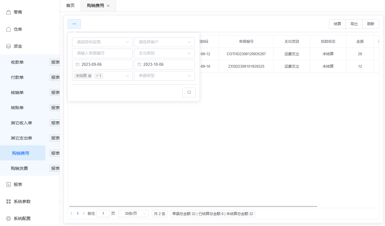购销费用是对单据(采购、采退、销售、销退)中费用的结算,购销费用中展示了所有包含费用的单据,其内容包括:费用类别,结算状态,结算金额等数据,更加方便直观的了解到费用的结算情况,单据较多时,可以使用左上角搜索按钮,对不同条件进行搜索,查找到需要结算的单据费用,然后在最后的结算金额中填写金额数,点击右上角结算,就会把需要结算的金额、费用类别数据带到其它收入、支出单中,然后再填写下方的实际金额,实收、付金额,结算账户,关联人员,点击右上角保存,并且审核后此费用结算完成,结算完成的单据可在购销费用报表中查看。