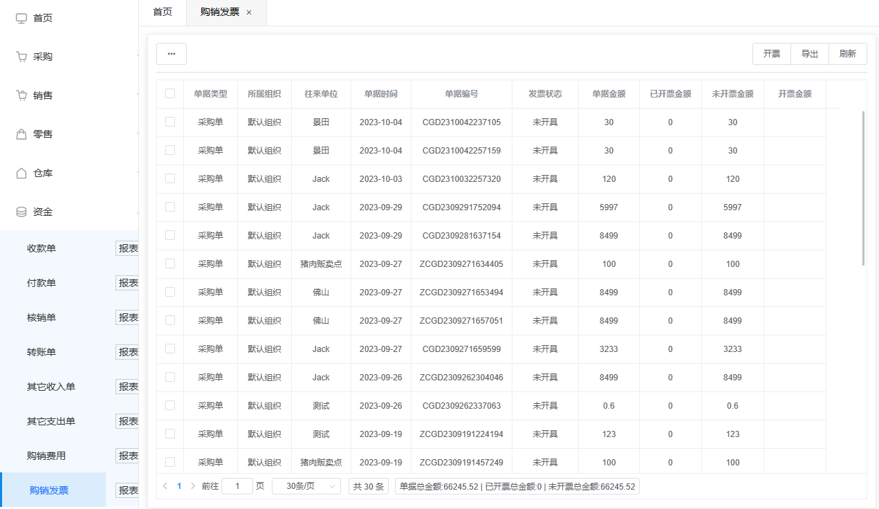 购销发票是对单据金额的开票记录,购销发票中展示了所有单据,以及单据的金额,开票状态,已开票、未开票金额等数据,左上角可以进行多维度搜索,查询到您所需要记录发票的单据,然后再开票金额中填写入开票金额,点击右上角开票,会弹出发票详情弹框,填写金额,开票时间,发票号码,发票抬头等信息,点击开票及算记录完成,然后在购销发票报表中查看已经记录的发票信息即可。