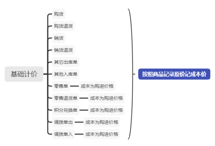 计价方法,计价方式方位三种:基础计价、移动平均、先进先出,其中基础计价为按照商品模块的采购销售价进行计价,移动平均和先进先出都为财务标准计价方法。